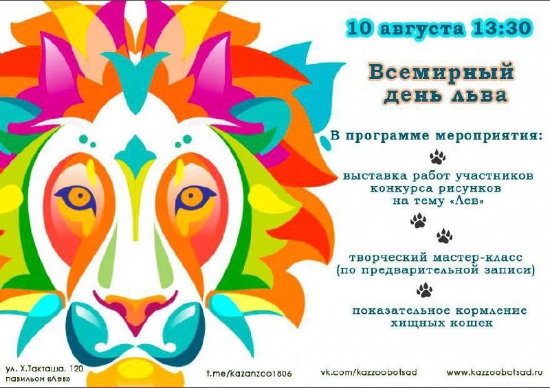 В воскресенье, 10 августа, Казанский зооботсад отпразднует Всемирный день льва🦁 Вас ждёт: 🔹 Выставка детских рисунков, посвящённых царю зверей. 🔹 Показательное кормление хищников. 🔹Мастер-класс по созданию шопера с символикой праздника. Участие в мастер-классе по предварительной записи. Торопитесь оставить заявку на почте zoo_emo@mail.ru Места ограничены! Возрастное ограничение 10+ ⏰ Начало в 13:30 на новой территории «Река Замбези» @kazandetki Больше информации в нашей группе, переходите