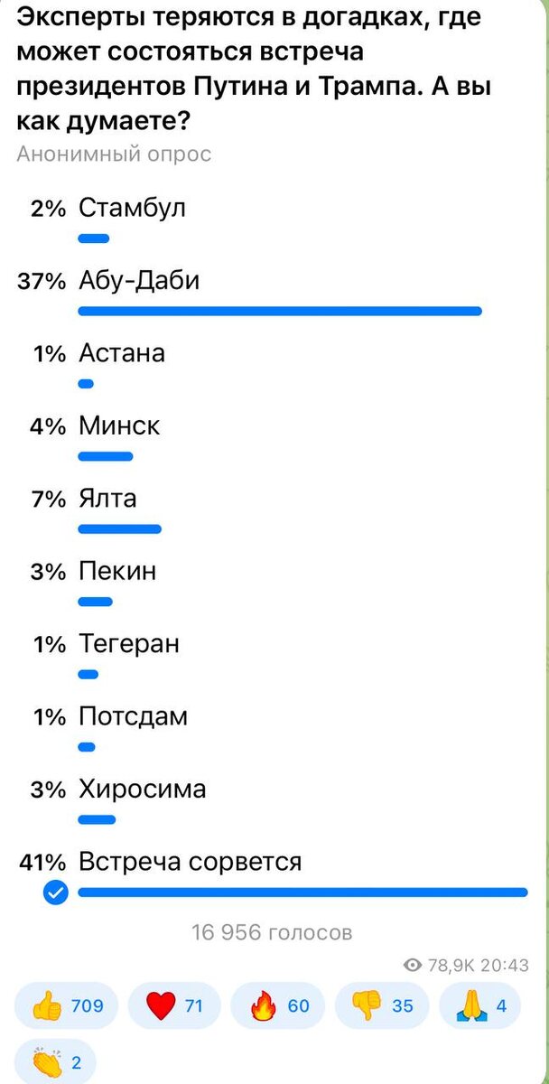 ⚡️⚡️⚡️ 41 процент подписчиков считают, что встреча сорвется. Ее место уже известно - штат Аляска. Но факт - Украина и ее кукловод Великобритания постараются сделать все, чтобы сорвать прямые переговоры российского и американского лидеров. Нельзя исключать вероятности, что и Трамп с ними в сговоре. Коллективный Запад нас обманывал неоднократно. Но Путин - один из самых матерых политиков в мире. И без нас знает, как себя вести с Трампом.
