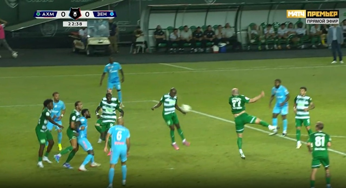 Ахмат -Зенит 24 мин. Правильное решение принимает Буланов и продолжает игру. Игрок команды Ахмат играет в мяч и попадает себе в руку. Правильное решение: Продолжить игру.