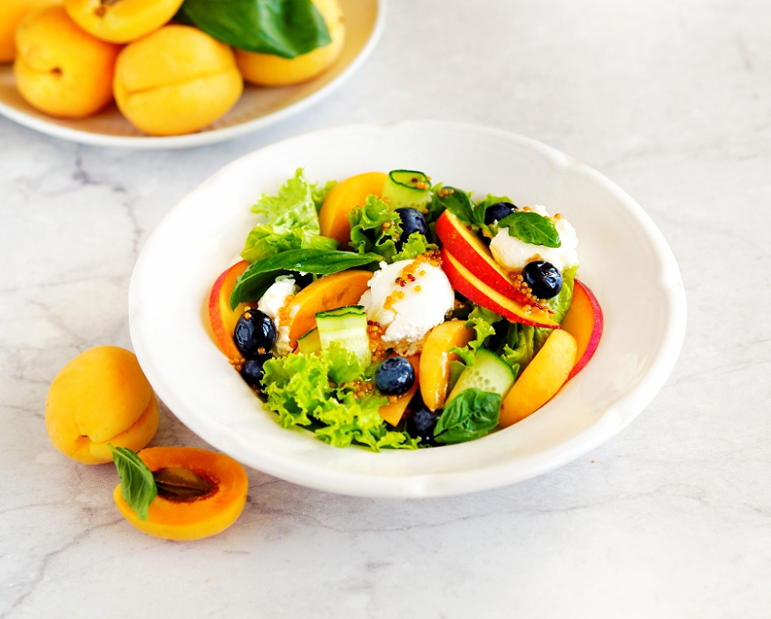 Если вы любите абрикосы, тогда вам нужно приготовить этот летний и очень вкусный салат. Сладкие, нежные абрикосы в сочетании с мягким сыром и медово-лимонной заправкой, хрустящие листья салата, освежающий огурец, ягоды голубики, и всё это в одной тарелке. Это даже представлять вкусно.