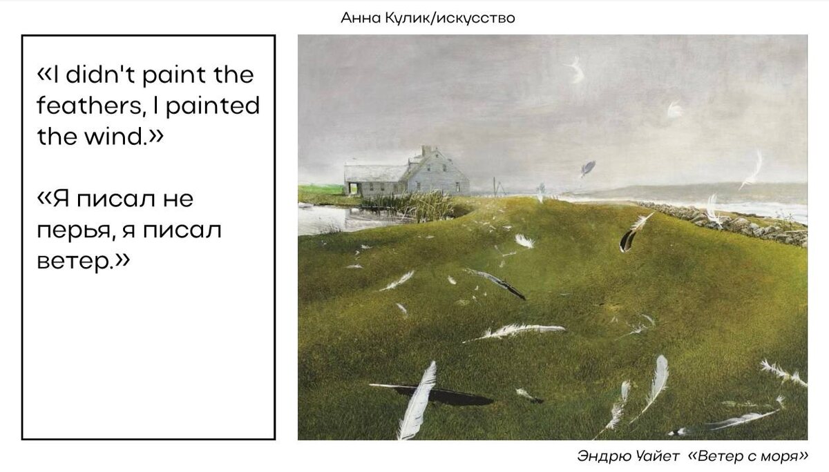 Уайет не просто изображает предметы, он рисует невидимое: движение воздуха, дыхание моря, полет мысли, сам дух свободы и воспоминаний, который проникает в закрытое пространство. Перья – лишь осязаемое свидетельство этого невидимого присутствия.🧡
