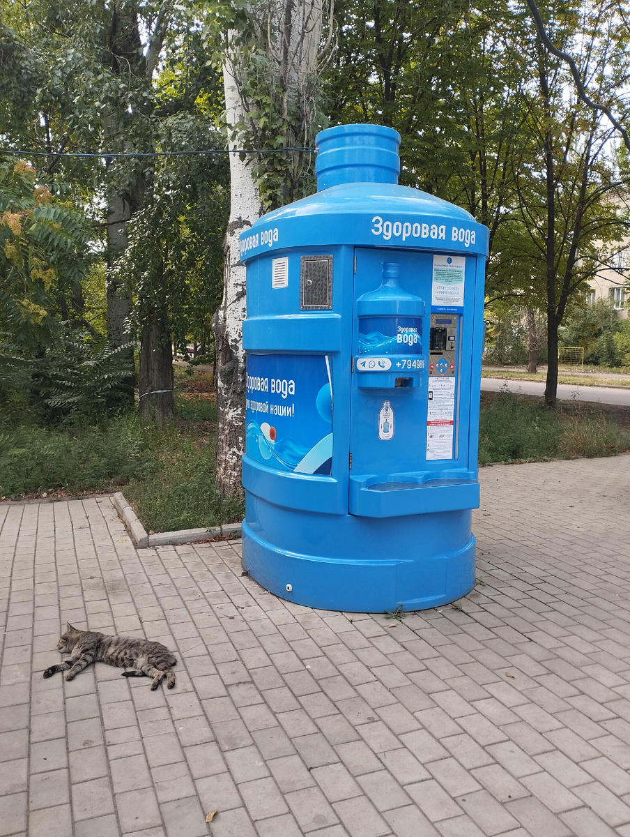 Не беспокойтесь, с кошкой, которая валяется у водомата, всё в порядке. Я фейки не создаю и не распространяю, как те, кто хайпует на недружественных ресурсах: Кошка просто решила поваляться, иногда приоткрывая глаза, чтобы следить за несколькими голубями, что слева за её головой в кадр не поместились. Теперь вновь напишу о том, что стараюсь на своём канале писать максимально объективно как о проблемах, так и об их решении: Без использования кошечек, собачек и малолетних детей, которых, как известно, переиграть невозможно. Теперь про воду техническую и очищенную. На днях в группе в телеграм, с которым с сегодняшнего дня возникли определённые проблемы, появилась информация с адресами, где можно набрать первую. Один из них - котельная в соседнем дворе. Иду туда на разведку. Ничего не нахожу, потом вижу легковую машину и женщину, которая заполняет пластиковые канистры, чтобы загрузить их в багажник. Вода не ржавая? Можно использовать для унитаза и для мытья пола? Нет, не ржавая. И без зап