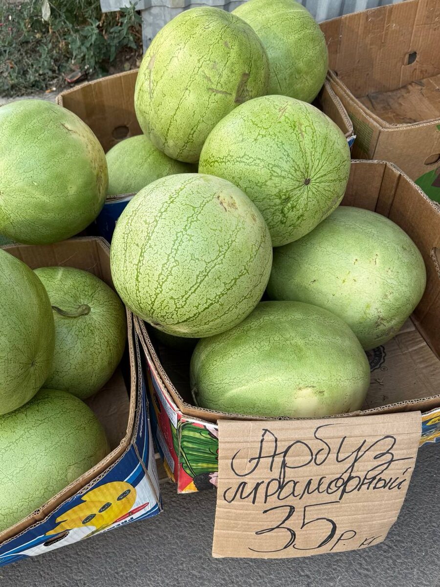 Мы сегодня купили в супермаркете желтый арбуз, по дороге домой в ларьке увидели мраморные арбузы.