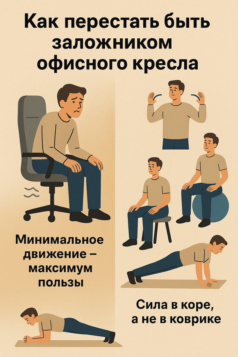 …тело и разум реагируют на одно и то же: неподвижность. Но важно другое — есть логика разрушения, и есть путь к восстановлению, если понять механизмы и начать двигаться иначе. Первое, что нужно внедрить — это понимание: пассивность — это не отдых. Это напряжение, только в замаскированной форме. Когда вы много сидите, особенно в одном и том же положении, тело словно застывает в режиме «замереть». А потом начинается: спазмы, тянущая боль в пояснице, тяжесть между лопатками, будто на плечах рюкзак с камнями. Это не возраст, не “неудобный стул” — это застой. Здесь не нужны подвиги. Начните с малого: вставайте каждый час хотя бы на пару минут. Сделайте несколько кругов плечами, мягко прогнитесь назад, посидите на краешке стула и наклонитесь вперед, отпуская корпус вниз. Это уже перезагружает рецепторы, улучшает кровообращение и снижает мышечное напряжение. Попробуйте технику «активного сидения»: сидите не развалившись, а с лёгким напряжением мышц спины и живота. Можно даже заменить обычный