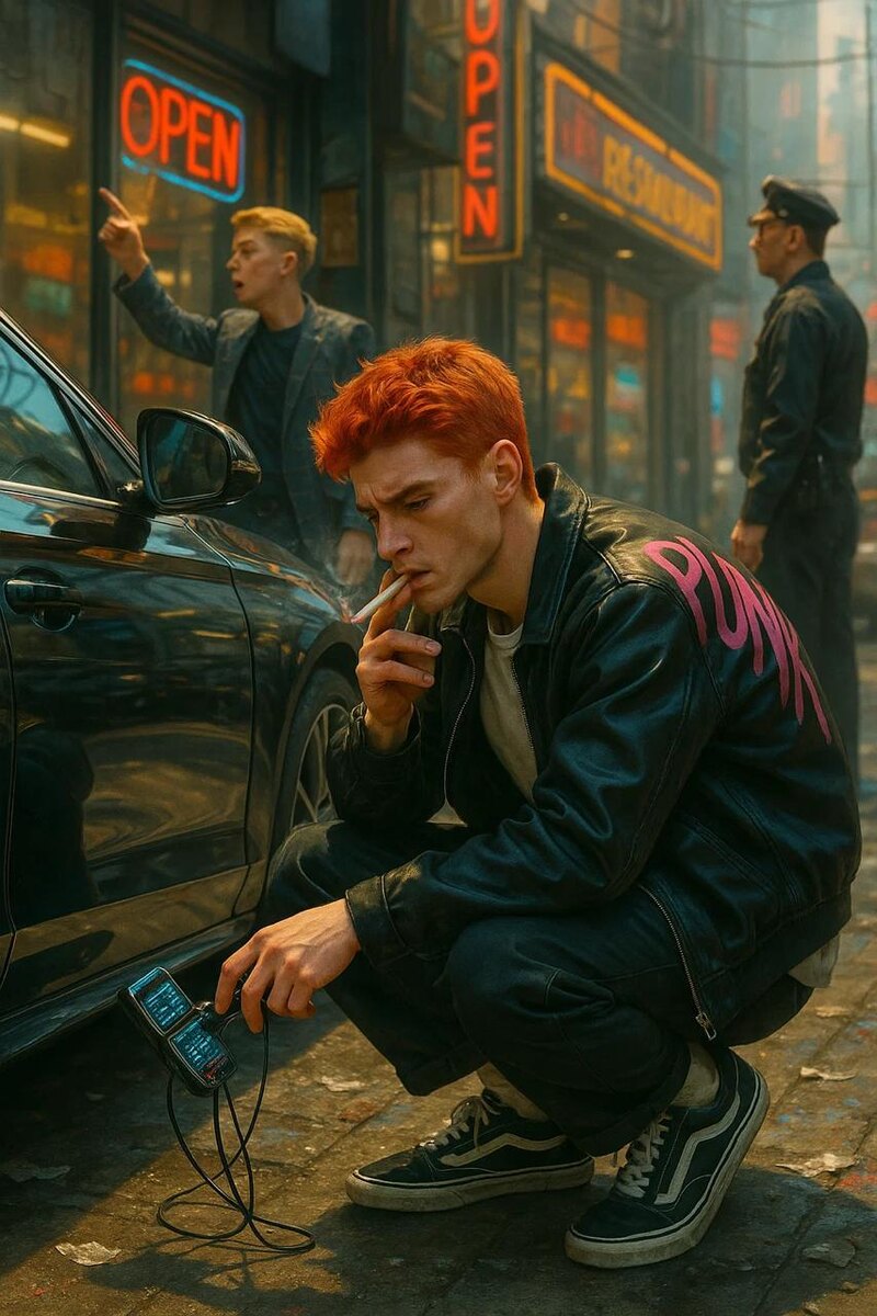 Отокомаё прилип к столбу и закурил. Он видел как Виргин подошёл к охраннику и начал что-то говорить, показывать на витрину ресторана, в котором сидел хозяин Ройса с красивой дамой. Отокомаё пробил номера тачки с помощью программы, которую для него разработал Наруками. «Хозяин тачки – Красилов, сынок шишки из корпы. Мда, Мэджик, умеешь ты подкидывать работёнку. Ладно, заднюю давать поздно. Связь охраннику я не отрублю, надо бы попросить Ками сделать мне что-то вроде ЭМИ. Будет погоня». Виргин подошёл к витрине и начал тыкать пальцем куда-то в потолок. Охранник подошёл к нему. Ото с сигаретой в зубах быстро подлетел к своей цели. Он присел на корточки и достал устройство, с помощью которого открывает двери. Зеленая полосочка на дисплее заполнилась, дверь открылась. Ото осмотрелся назад и увидел, что Виргин смотрит на него, а охранник начинает разворачиваться. Наёмник махнул ладонью вперёд пару раз. Виргин энергично развернул охранника обратно к витрине и начал оживлённо махать руками. Жучок на ухе Отокомаё горел красным. Это свидетельствовало об отказе в доступе. Красноволосый подключил жучок к дисплею автомобиля. Доступ можно было получить после ввода пароля. «1111. С*ка, ладно». Он снова достал устройство и подключил антенку к своему жучку. Выглядело это так, будто он ковыряется в ушах. Жучок загорелся синим. «Есть. Так, стираем тачку со всех баз данных, слава Богу прога Наруками обходит все двойные аутендификации…местоположение…нахер…так, это тоже отключить… бырее, бырее, грузись, шлюха…всё, тачки не существует! Пора убираться с этого ублюдского района».