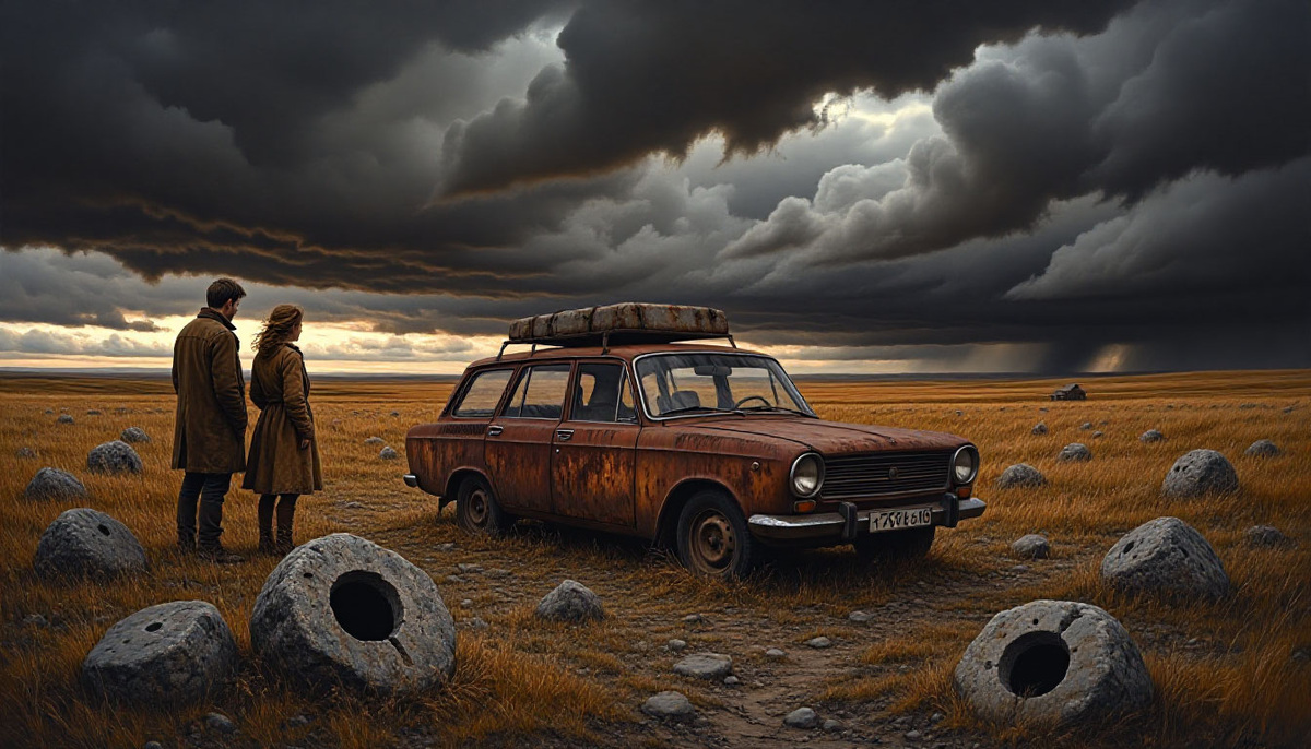Дорога быстро превратилась в едва заметную колею и привела нас в сердце Пустоши. Название родилось у меня в голове само собой. Это была огромная, плоская, серая равнина, покрытая растрескавшейся, как кожа старика, глиной. Здесь не росло ничего. Ни травинки, ни чахлого кустика. Только камни. Странные, темные валуны, испещренные идеально круглыми, гладкими сквозными отверстиями, будто кто-то гигантским сверлом проделал в них дыры.