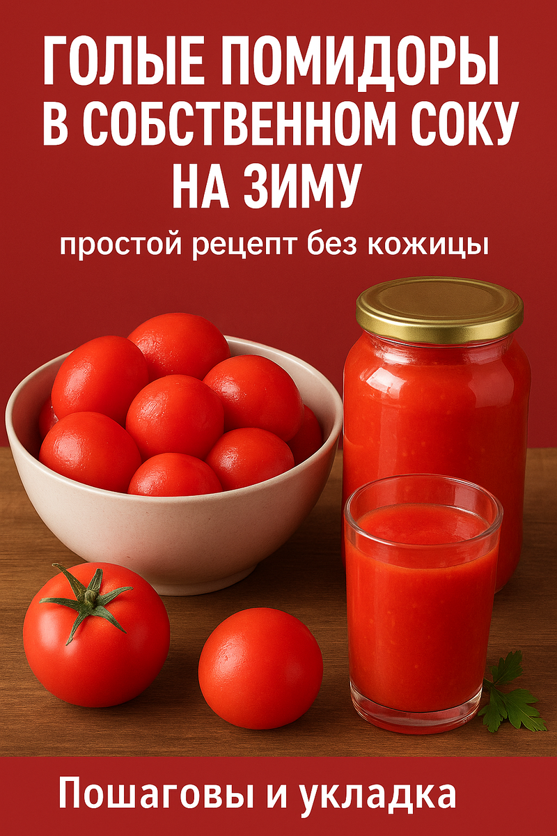 Голые помидоры в собственном соку на зиму — простой рецепт без кожицы Почему этот рецепт стоит попробовать Зимой открываешь баночку — и на столе аромат лета! Помидоры в собственном соку без кожицы идеально подходят для борща, соусов, пиццы или просто к мясным блюдам. А готовятся они быстро и без лишних специй. --- Ингредиенты: Помидоры спелые — 3 кг Соль — 2 ст. л. Сахар — 2 ст. л. (по желанию) Лимонная кислота — 1 ч. л. или уксус 9% — 2 ст. л. --- Пошаговый рецепт 1. Подготовка помидоров Выберите спелые, но плотные томаты. На каждом сделайте крестообразный надрез. Обдайте кипятком на 30–40 секунд, затем переложите в холодную воду. Снимите кожицу — теперь это «голые» помидоры. --- 2. Разделка и укладка Мелкие помидоры оставьте целыми, крупные разрежьте на половинки или четвертинки. Плотно уложите в стерилизованные банки. --- 3. Приготовление сока Оставшиеся помидоры пропустите через мясорубку или измельчите блендером. Получившийся сок доведите до кипен
