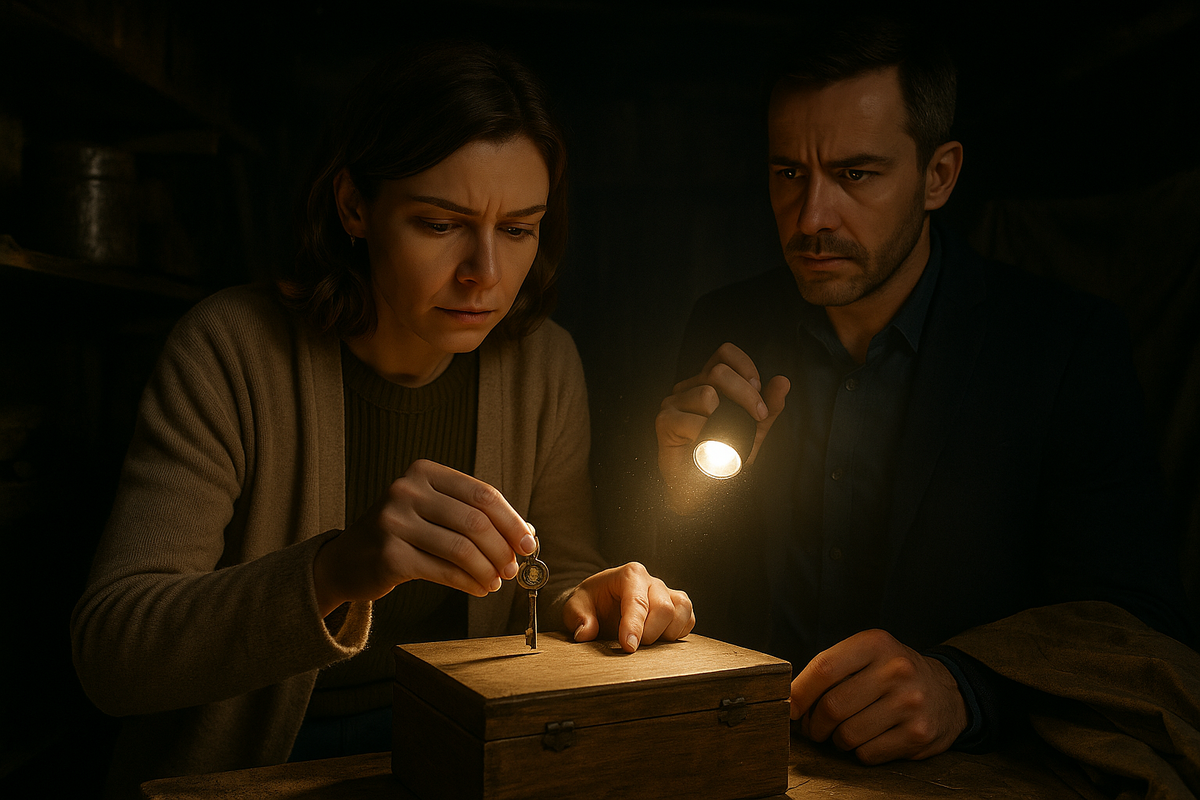 Сарай стоял в дальнем углу двора, почти утонувший в бурьяне. Доски почернели от времени, а железный замок выглядел новым — как будто повесили его недавно. Марина пригляделась: на металле не было ржавчины, а края блестели. — Кто-то очень не хотел, чтобы сюда заглянули, — тихо сказал Алексей, оглядываясь по сторонам. Марина нашла в углу под бочкой тяжёлый молоток. Держа его обеими руками, она ударила по замку. Раздался глухой металлический звук, замок дрогнул, но не поддался. Алексей забрал молоток, ударил ещё дважды — замок сорвался и упал в траву. Внутри пахло старым деревом и чем-то прелым. На полках стояли ржавые банки с гвоздями, сломанные инструменты, а в дальнем углу — деревянный ящик, накрытый брезентом. Марина подняла брезент и замерла. Ящик был закрыт на маленький замок, почти такой же, как тот, что открывал буфет в её квартире. Она достала ключ с медальоном, попробовала — подошёл идеально. Внутри лежали аккуратно уложенные папки и плотный конверт. На конверте было написано от