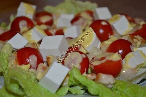 Салат «Цезарь» От автора: Салат «Цезарь» - это распространенный и знаменитый салат, но если честно сказать данный кулинарный рецепт приготовленный дома, будет вкуснее большинства салатов приготовленных в небольших кафе вашего города. Ингредиенты: Сыр Фетакса - 200 гр. Хлеб - 200 гр. Куриная грудка - 300 гр. (филе) Салат китайский - 1 кач. (3 листа) Чеснок - 2 зуб. (1 на соус) Томаты Черри - 100 гр. Масло оливковое - 18 мл. (2 ст. л. на соус) Яйцо - 2 шт. (нам понадобятся только вареные желтки) Горчица - 10 гр. Лимон - 1 шт. (сок 0,5 лимона) Источник: https://rusdinner.ru/page/salat-cezar
