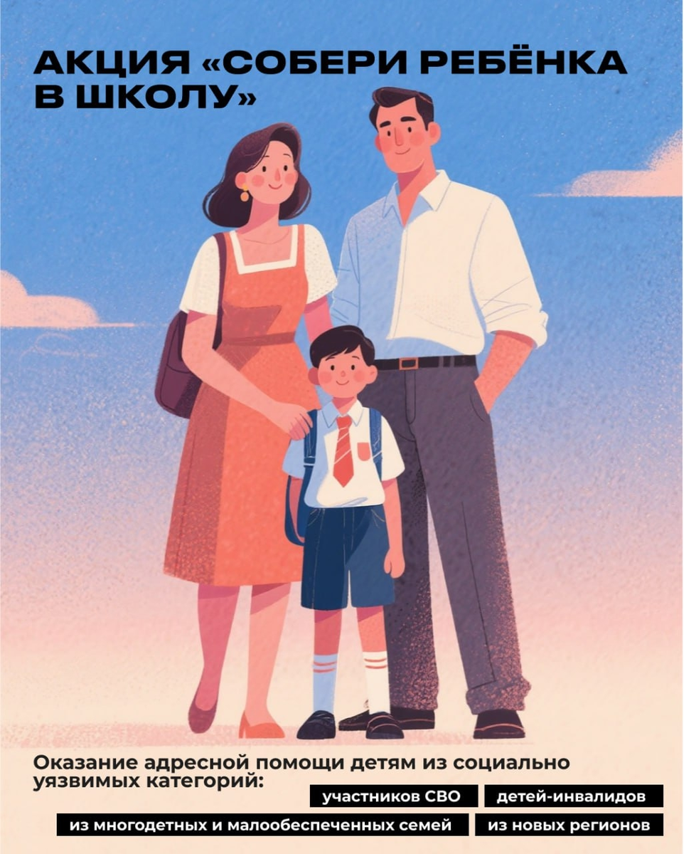 Это федеральная традиционная акция от партии «Единая Россия», которая проходит по всей стране перед Днём знаний. Адресную помощь оказывают детям из социально уязвимых категорий: участников СВО, детей-инвалидов, из многодетных и малообеспеченных семей, а также из новых регионов.