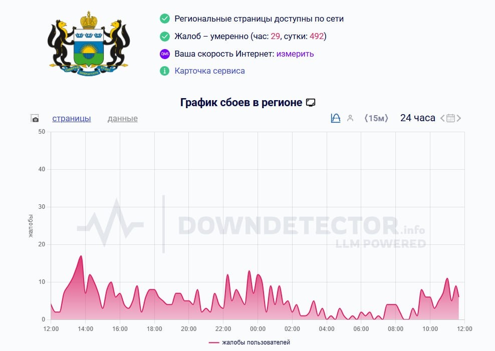 ❗️В Тюменской области вновь зафиксированы перебои с интернетом и связью. По данным сервиса Downdetector, за последние сутки поступило 492 жалобы от жителей региона, из них 29 — за последний час. Пик обращений пришелся в ночь с 9 на 10 августа. Чаще всего пользователи сообщали о проблемах в работе интернет-сервисов (53% жалоб), а также о перебоях в работе сайтов и мессенджеров (по 11%). Жалобы также поступают на операторов мобильной связи. Подписаться | Забустить