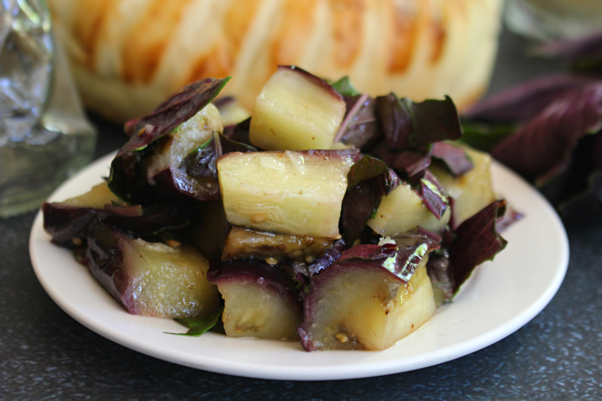 Этот рецепт для любителей не жареных баклажанов. Тут мы будем баклажаны варить. Благодаря этому, закуска получается совершенно не жирная, легкая и очень сочная. Из зелени тут используется именно базилик, он отлично сочетается с чесноком и баклажанами, а другая зелень не даст того, нужного аромата. Количество чеснока можно менять по своему настроению и уксус тоже отрегулируйте по своему вкусу. Вместо уксуса можно использовать лимонный сок. Готовится такая закуска быстро, просто и ее сразу можно подать к столу. Если же вы не торопитесь, то можно дать закуске постоять в холодильнике час-два. Баклажаны - 400 г. Базилик - 20-30 г. Чеснок - 2-6 зуб. Масло растительное - 2 ст.л. Уксус 6% - 1-2 ст.л. Перец черный молотый - щепотка Соль - по вкусу Варим баклажаны в кипящей воде минут 8-12. Проверяем вилкой, баклажаны не должны быть сильно мягкие и переваренные. Время варки зависит от размера овощей. Воду сливаем, баклажаны остужаем и слегка отжимаем от воды. Есть варианты закусок, где вареные б