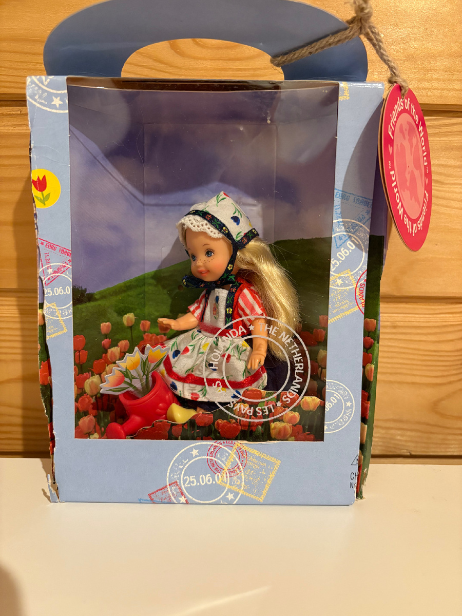 Всем привет! Сегодня хочу поделиться с вами новостями о первой Kelly в коллекции. Вообще заселять куколок Келли я не планировала, их не было в моем виш-листе. Но когда я увидела в продаже Келли из Голландии, поняла, что это будет идеальным дополнением к моей голландской Барби, о которой я писала здесь: Тем более ее можно было приобрести у того же продавца с большой скидкой. Я решила, что это судьба, и вот она у меня: очаровательная малышка Келли из Голландии. Коробка выглядит так странно, потому что эта Келли - часть сета Friends of the world, выпущенного в 2002 году. В этот сет еще входили Келли из Испании и Кении. Ну а мне нужна была именно голландская Келли, которая так удачно осталась в продаже. У этой коробки еще очень удачный фон, который можно использовать как фотофон. У Келли также как и у Барби в образе много аутентичных деталей: хюль-чепчик, веселенькие желтые кломпы, национальные узоры в отделке одежды. Плюс в комплекте идет букетик тюльпанов и леечка. Это первая Келли