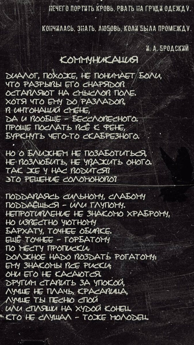 «Нечего портить кровь, рвать на груди одежду. Кончилась, знать, любовь, коли была промежду.» И. А. Бродский Коммуникация Диалог, похоже, не понимает боли, Что разрывы его снарядов Оставляют на смыслов поле. Хотя что ему до разладов, В интонаций смене, Да и вообще – бессловесного. Проще послать всё к фене, Буркнуть чего-то скабрезного. Но о ближнем не позаботиться, Не возлюбить, не уважить оного. Так же у нас водится? Это решение Соломоново? Поддаваясь сильному, слабому Поддаёшься – или глупому. Непротивление не знакомо храброму, Но известно уютному Бархату, точнее обивке. Ещё точнее – горбатому По месту прописки. Должное надо воздать рогатому: Ему знакомы все риски; Они его не касаются. Другим ставить за упокой, Лучше не плачь, красавица, Лучше ты песню спой Или спляши на худой конец. Кто не слушал – тоже молодец. А. С. Корзин