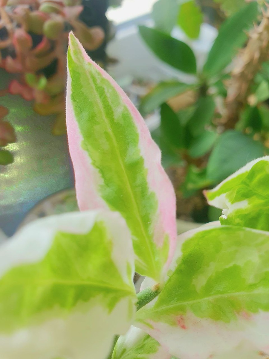 #педилантус Просто любуюсь свежим загорелый листочком Педилантуса Титималоидного Вариегатного 🪴 Зимой он у меня сильно облетел, усох, погрустнел. Пришлось выкопать и отправить в водичку на повторное наращивание корней✅ Задачу он выполнил просто прекрасно, поэтому переехал в свежий грунт в горшочек по размеру корневой системы. Набирает рост! 🍀