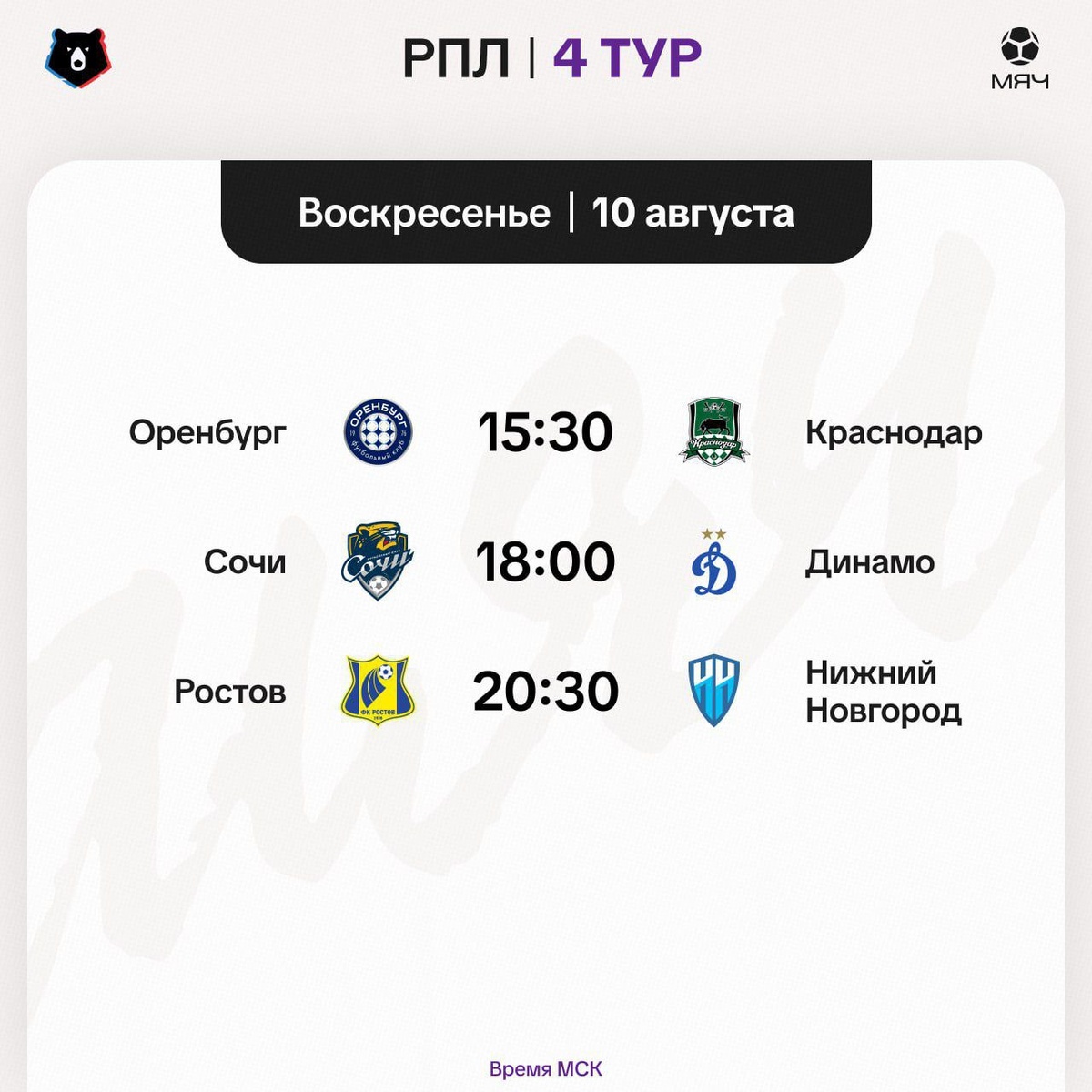 Четвертый тур РПЛ завершается сегодня тремя матчами. Действующий чемпион «Краснодар» играет в Оренбург, «Динамо» снова сыграет с «Сочи», а кто-то из пары «Ростов»/«Нижний» точно возьмет первые очки в сезоне.