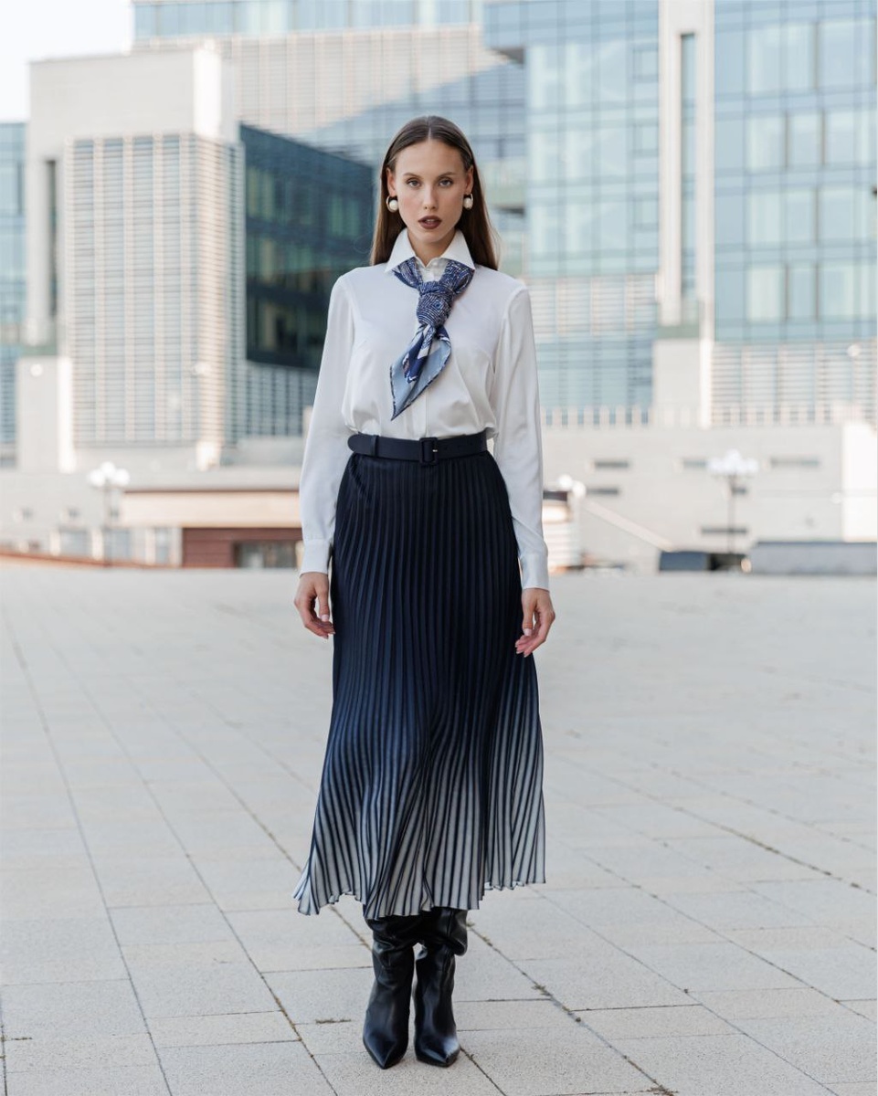 Градиент – абсолютный must-have сезона Осень’25 Если вы хотите освежить свой гардероб, обратите внимание на юбку-плиссе с завораживающим переходом от глубокого синего к элегантному серому. Этот эффектный элемент станет настоящей находкой для создания разных образов. Чтобы добавить строгости, сочетайте юбку с классической белой блузой – такой look идеально подойдет для офисных встреч или деловых мероприятий. А если вы хотите добавить немного блеска и яркости, смело выбирайте серую блузу с роскошным золотым мерцанием. Такой образ не только подчеркнет вашу индивидуальность, но и сделает вас центром внимания на любом мероприятии. С коллекцией BUSINESS LINE вы всегда сможете создавать стильные и запоминающиеся образы, которые подчеркнут вашу уникальность! Для заказа пишите на наш WhatsApp: https://wa.me/message/GESSL37P7LULC1