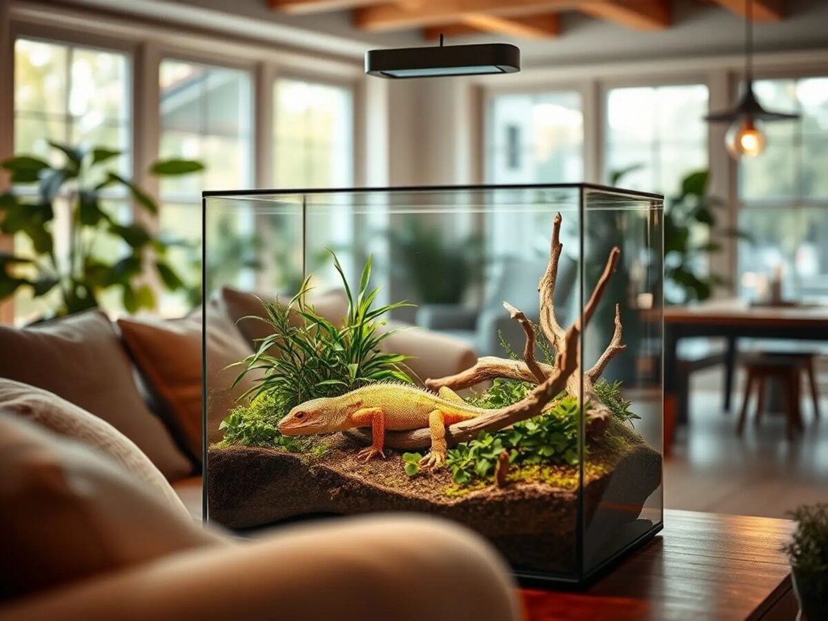 - Освещение — два типа: УФ лампа для дневного цикла (10-12 часов) и керамическая для ночного обогрева