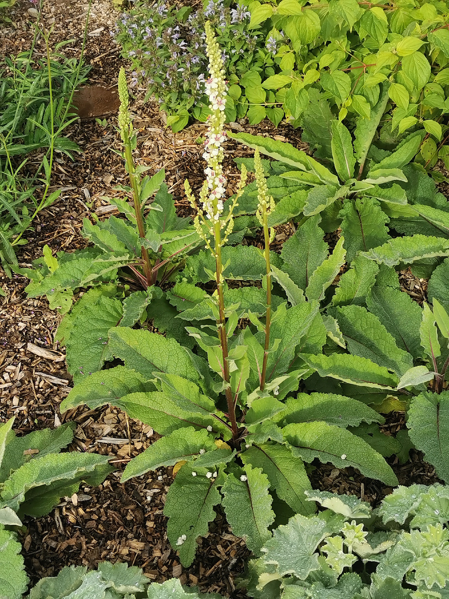 Белый вербаскум - посев этого года из семян Расти-Цвети, как и обещался, зацвел в год посева: Поздновато, конечно, но уж какое лето... Не все розетки с цветоносами, а кое-где есть сразу 2-3 и кажется будет весь одинаковый, белый. ЧуднОе растение, необычное! Розетка листьев практически плоская, красивого зеленого оттенка с голубым подтоном, но ее особо не видно, только если сверху смотреть, но я же не пчела). Если честно, то мне в растениях больше нравится зеленый объем, нежели само цветение. С другой стороны при хорошем фоне вот такие цветоносы очень выигрышно могут смотреться Цветоносы у вербаскума знатные - мощные, и с боковыми ответвлениями. Поэтому, как Людмила Расти-Цвети писала - настоящий канделябр будет. Окраска цветка белая и в центре имеется малиновое пятно, образованное тычинками: Интересное растение, за которым нужно еще наблюдать. Какой высоты будет в дальнейшем, какой объем будет давать розетка листьев, если будет вообще. И подбирать фон. Почвопокровный эффект от