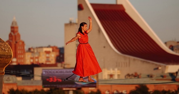 «Девушка в красном» сразу покорила легкостью, с которой она пересекала опасное расстояние. На фоне куполов часовни Серафима Саровского и трамплина Музыкального театра «парение» канатоходки на высоте пятиэтажного дома по-настоящему потрясало.