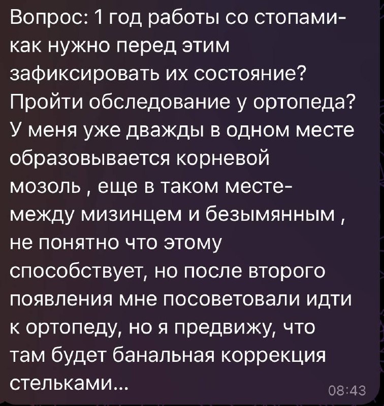 Рекомендации: 1. Фото стоп: сверху, справа, слева. 2. Фото себя в полный рост (в белье/купальнике): фас, профиль (справа, слева), со спины. Фиксация «до» - это расположение стоп, ног, длина рук, ось позвоночника, высота тазовых костей, лордоз, кифоз… Это и заметные ориентиры - то, что сразу бросается в глаза и то, что можно увидеть с помощью линейки - разность длин конечностей, вертикаль позвоночника, горизонталь таза… Коррекция стоп - это работа со всем телом: коррекция осанки, плюс гимнастика стоп и расслабление спазмированных мышц: ванночки для ног, принятие солевых ванн, бани, массажи… Зафиксировав результат «До» и через год «После», при регулярных практиках и соблюдении моих рекомендаций - Вы увидите результат на фото (объективные факты) и ощутите разницу в походке, усталости/бодрости, сне, как сидит на вас одежда/ обувь, ощущения в теле (субъективные факты). Фото - это, то что будет Вас мотивировать не останавливаться ❤️❤️❤️ Вот почему, уже МНОГО лет я делаю гимнастику для ли
