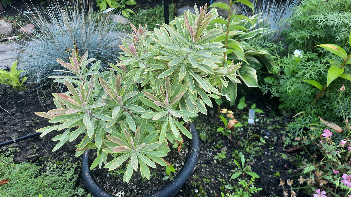Решила сегодня показать и поплакаться. Что-то цветет, что-то ,,цветет,,. Вот молочай. Разросся отлично. Нарядный очень. Закустился прекрасно. Был один цветонос, который я обломила нечаянно наполовину, когда процвел, обрезала. Он и сам, как цветок. Зимовать будет на втором этаже, поэтому и в горшке. Как выяснилось после заказа, а я купилась на москвичей, у нас он зимовать не будет. думаю, а не посадить ли ему для компании и трицитрис в горшок, а то он тоже рискованный зимовщик. Рядом висит лобелия. Лобелии нынче не радуют меня. Это последняя порция майского посева. Или апрельского. Долго в парнике сидела, пока огурцы маленькие были. Потом попихала в гршки и еще куда-то, где место нашла. Из той же партии. Совсем укромное местечко, потому как крюк ни на что одеваться не хочет. Здесь тени много, но ничего, выживает. Поливать иногда забываю. Флоксы однолетние тоже распиханы по разным местам. Здесь горшок под лавандой стоит. Обрежу лаванду, будет красоваться. Эта партия флоксов спасла о