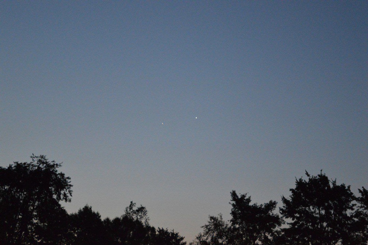 Так что, вооружившись фотоаппаратом и задором, мы вышли в 4 часа ночи. Вот эти две точки — это они. Нам ещё повезло, ибо минут через 20-30 не было видно даже Луны из-за прекрасных облаков, которые, как занавес, закрыли всё.