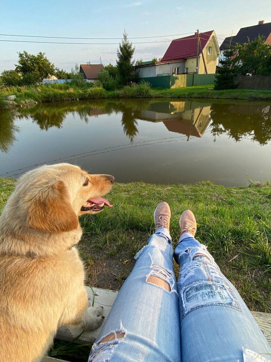 Сегодня Аня грустила и мы прогулялись вместе по нашему обществу. Оказывается, недалеко от нас есть красивое местечко с озером и детской площадкой. За нами увязался гулять соседский пес. Знакомьтесь - это Чарлик. Спонсор моих красивых ног без косточек)) Если бы не наша встреча весенним слякотным вечером три года назад, то неизвестно, когда бы я ещё дошла до травматолога. Как это ни странно звучит, я ударилась об него ногой 🤭 Нет, не ударила, а именно ударилась) Этот пес, реактивная, рыжая пуля с веселый характером. Своей неуёмной радостью, он хочет одарить всех, кто попадается ему на пути 🤭 В тот вечер было очень слякотно и Чарлик, жутко чумазый, понесся в сторону Анюты. Чтобы это чудо не прыгнуло на неё от радости, я преградила ему путь ногой. Не успев затормозить, он в неё врезался. Его маленькая приземистая тушка, неожиданно оказалась очень тяжелой и твердой. Было ощущение, что мне по ноге, прилетел кирпич 🤭 После этой встречи, у меня заболела стопа. И болела она, больше двух