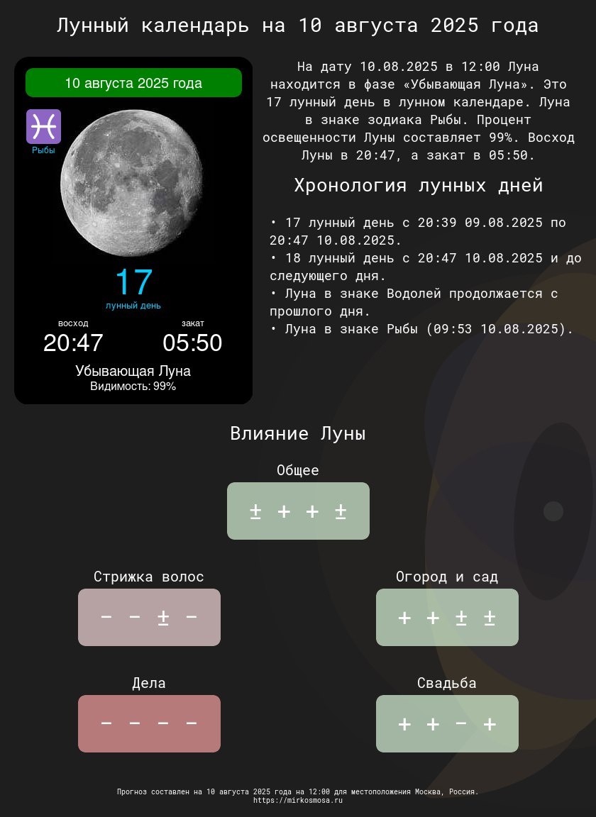 Лунные календари на 10 августа 2025 года: Подготовьтесь к этому дню с учетом влияния Луны! 🔹🌗 Лунный календарь на 10 августа 2025 года — Что приготовила Луна? Подробнее 🔹✂️ Лунный календарь стрижек на 10 августа 2025 года — Подходящий ли день для обновления прически? Подробнее 🔹🌱 Лунный календарь огородника и садовода на 10 августа 2025 года — Лучшее время для ухода за растениями. Подробнее 🔹📅 Лунный календарь дел на 10 августа 2025 года — Удачные моменты для важных задач. Подробнее 🔹💍 Лунный календарь свадеб на 10 августа 2025 года — Подходит ли этот день для вашего торжества? Подробнее