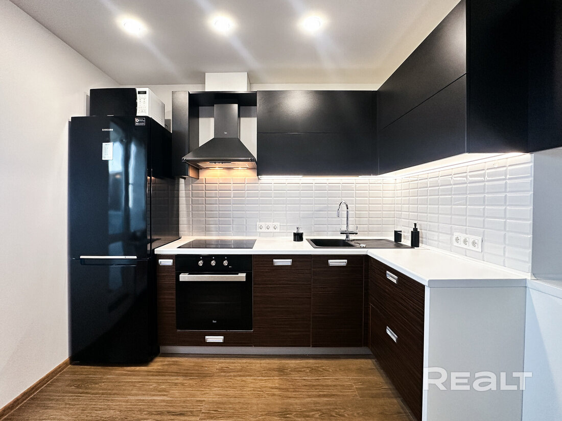 Кухня укомплектована всей необходимой техникой: варочной панелью, духовым шкафом, холодильником. Высота потолков достигает 2,75 метра. В окнах стоят стеклопакеты ПВХ, на полу — плитка и ламинат.