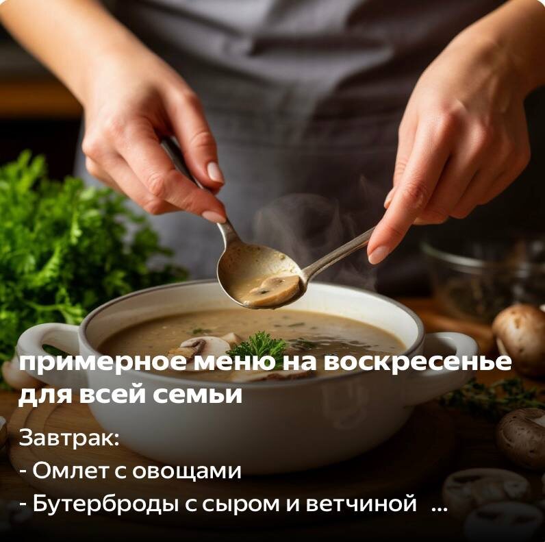 Завтрак: - Омлет с овощами - Бутерброды с сыром и ветчиной Обед: - Суп-пюре из шампиньонов - Плов с курицей и овощами Ужин: - Лазанья с мясом и соусом бешамель - Салат из свежих овощей с оливковым маслом и лимонным соком