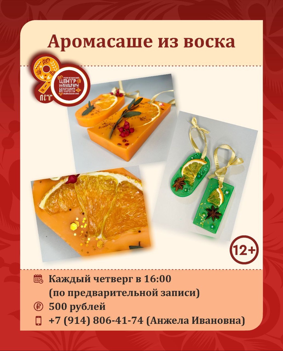 📣 Приглашаем на мастер-класс «Аромасаше из воска»! 💟 Аромасаше из воска – это не просто красивый декоративный элемент, это миниатюрный источник нежного аромата, способный наполнить уютом и теплом любое пространство. В отличие от промышленных освежителей воздуха, аромосаше изготавливаются вручную, с любовью и заботой, что делает их не только экологичным, но и невероятно душевным подарком себе и близким. 🧪 Процесс создания аромосаше – это своего рода алхимия, в которой простые компоненты, такие как воск, эфирные масла и сухоцветы, превращаются в нечто прекрасное и функциональное. Это увлекательное хобби, позволяющее раскрыть свой творческий потенциал и создать уникальные ароматы, отражающие вашу индивидуальность. 📆 Когда? - Каждый четверг в 16:00 👶 Возраст? - От 12 лет и старше 💰 Цена? - 500 рублей Записаться можно по телефону: +7 (914) 806-41-74 (Анжела Ивановна)