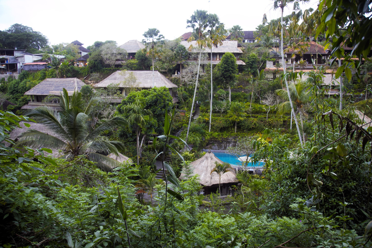К своему удивлению, мне, побывав на острове Бали, в первую очередь хочется рассказать не о храмах и узких дорогах, а о красивом и уютном отеле Tjampuhan, который основан в 1928 году и расположен в районе Убуд. Так как отель довольно старый, то там нет лифта, а до домика надо часто ходить по ступенькам вверх или вниз. Поэтому муж назвал этот отель - "Тысяча и одна ступенька". Отель окружён тропической зеленью и располагается на "знаменитой" (для меня очень грязной) реке Tjampuhan. За два дня мы там очень много ходили по ступенькам, чтобы рассмотреть территорию отеля и понежиться в двух бассейнах. Один был с довольно прохладной водой, в связи с чем там никто не плавал, кроме моего мужа. Второй бассейн был с более теплой водой, так как он был на открытой местности и лучше прогревался, но лежаки были почти пустые. Я не хотела мерзнуть в холодной воде, поэтому мы больше проводили время во втором бассейне, когда уставали от прогулок по Убуду. У нас домик находился на вершине горы. Номер с