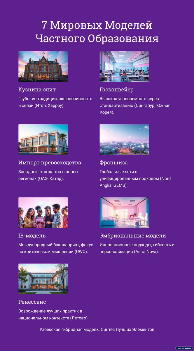 - Урок для Узбекистана: Это самый важный блок для нас. В контексте идеи «Третьего Ренессанса» частные школы могут и должны стать не просто «английскими» или «математическими», а площадками для формирования новой узбекской идентичности. Это означает не архаизацию, а переосмысление собственного интеллектуального наследия (Авиценна, Аль-Хорезми, джадиды) в контексте вызовов XXI века. Школа, которая сможет предложить такой глубокий синтез, будет иметь самое сильное и уникальное конкурентное преимущество.