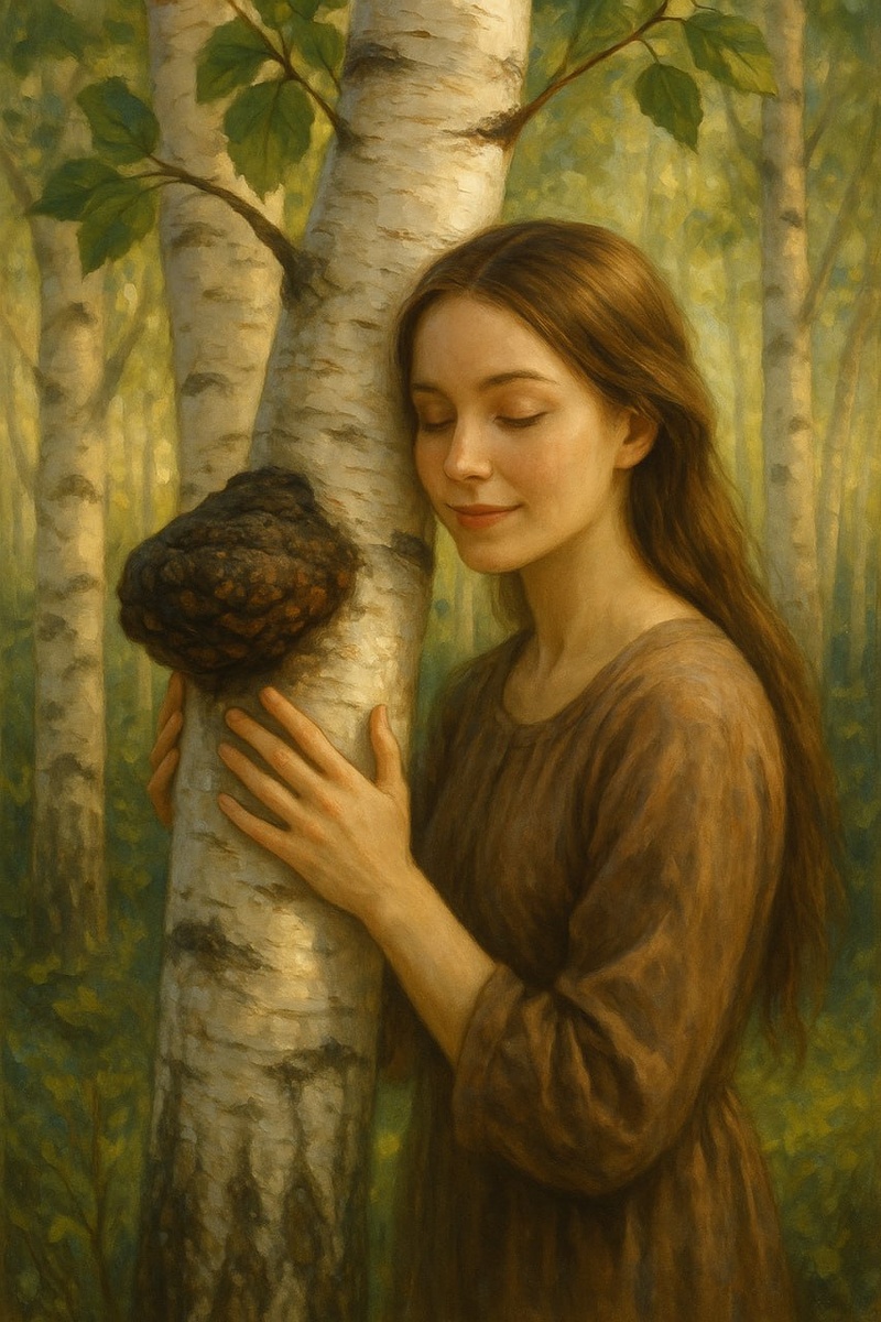 Маша, здравствуй, родная. Мне очень хочется поделиться с тобой одной встречей. Это было похоже и на откровение, и на игру, и на волшебное узнавание… а, может, всё сразу. Ай однажды посоветовал мне пить настойку Чаги — для поддержки сил и иммунитета. Я с радостью послушалась. Не потому что надо, а потому что сочетание «Берёза и Гриб» прозвучало для меня, как древняя песня. Мне всегда были интересны грибы — даже просто рассматривать их в лесу, узнавать их имена, свойства. А Берёза… ну разве нужно объяснять? Наша, русская, кудрявая красавица, белощекая, с каплей неба в сердце. Столько о ней написано, столько стихов спето. А ведь за всем этим — не просто ботаника, а живая Женственность, нежность, связь с Матушкой Землёй. Через несколько дней, в разговоре с отцом, он вдруг обмолвился: — Знаешь, читал, что Чага — это не совсем гриб. Это как будто сам нарост Берёзы. Слова эти запали. Я не побежала проверять в интернете. А решила: спрошу у самой Берёзы. Прошло пару дней. Ночью я пошла гулять.
