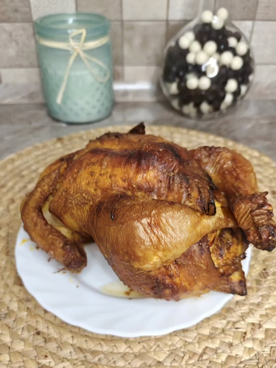 Сочное и ароматное блюдо с яркими цитрусовыми нотками, которое легко приготовить даже новичку. Свежие дольки апельсина и специи пропитывают мясо, делая его нежным внутри и аппетитно подрумяненным снаружи. Аэрогриль обеспечивает равномерную прожарку без лишнего жира, сохраняя натуральный вкус курицы и придавая ей золотистую корочку. Подходит как для праздничного стола, так и для повседневного ужина. Ингредиенты: Цыплёнок — 1 шт. (≈ 1200 г) Оливковое масло — 3 ст. л. Карри — 1 ст. л. Копчёная паприка — 2 ч. л. Сушёный чеснок — 1 ч. л. Чёрный молотый перец — ½ ч. л. Соль — 2 ч. л. Апельсин — 1 шт. (с кожурой) Приготовление: Промыть птицу и обсушить бумажными полотенцами. В миске смешать оливковое масло, карри, копчёную паприку, сушёный чеснок, перец и соль. Намазать цыплёнка маринадом снаружи и внутри, тщательно втирая специи. Убрать в холодильник на несколько часов или на ночь. Апельсин разрезать на 4 части вместе с кожурой. Заложить дольки в брюшко цыплёнка и зашить его кулинарной ни