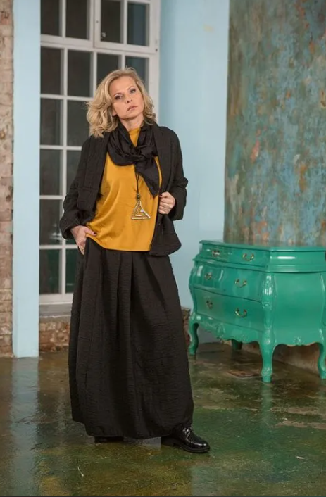 - Темная юбка макси свободного кроя и такого же цвета жакет оверсайз без застежек станут отличной основой для стильного образа. В качестве яркого элемента можно использовать кофточку горчичного оттенка. Из обуви подойдут черные кожаные ботинки (но только не на массивной подошве). Дополнить образ можно оригинальной подвеской и темным платком на шею.