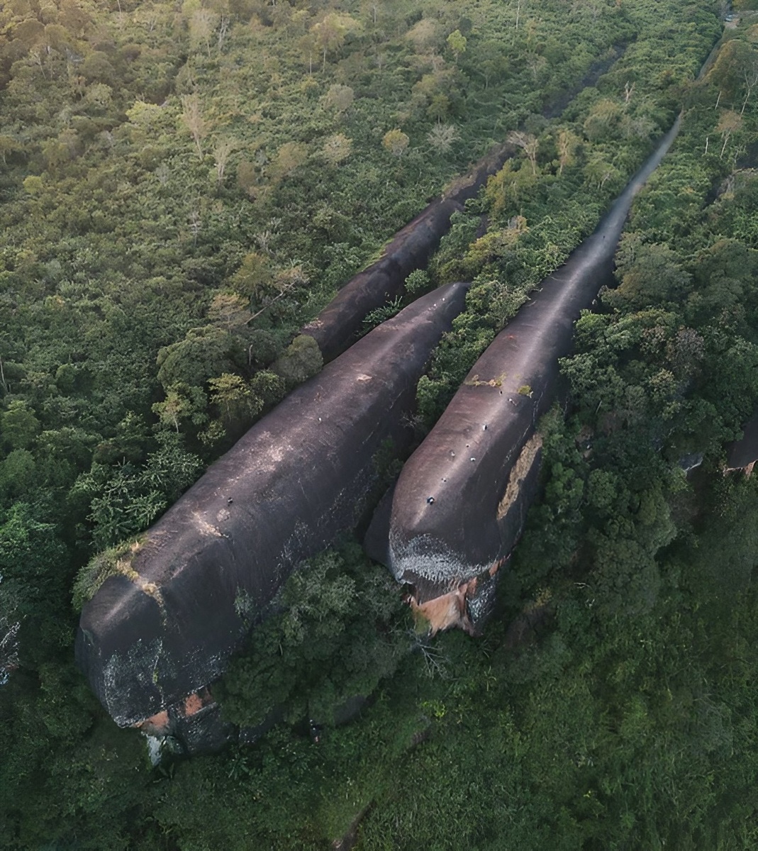 Хин Сам Ван, что переводится как "Три Кита Скалы", расположены в провинции Буенг Кан на северо-востоке Таиланда, в национальном парке Пху Синг. Это не просто обычные скалы — это массивные песчаниковые образования, выступающие из вершины холма на высоте около 200 метров над уровнем моря. Длина "китовой семьи" превышает 100 метров, и с определенного угла они действительно напоминают двух взрослых китов и одного детеныша, плывущих в океане. Скалы сформировались из песчаника, который когда-то был дном древнего моря, покрывавшего эту территорию в меловой период, около 75 миллионов лет назад. Со временем, под влиянием тектонических сил, земля поднялась, и эрозия — ветер, дождь и реки — выточила эти причудливые формы.