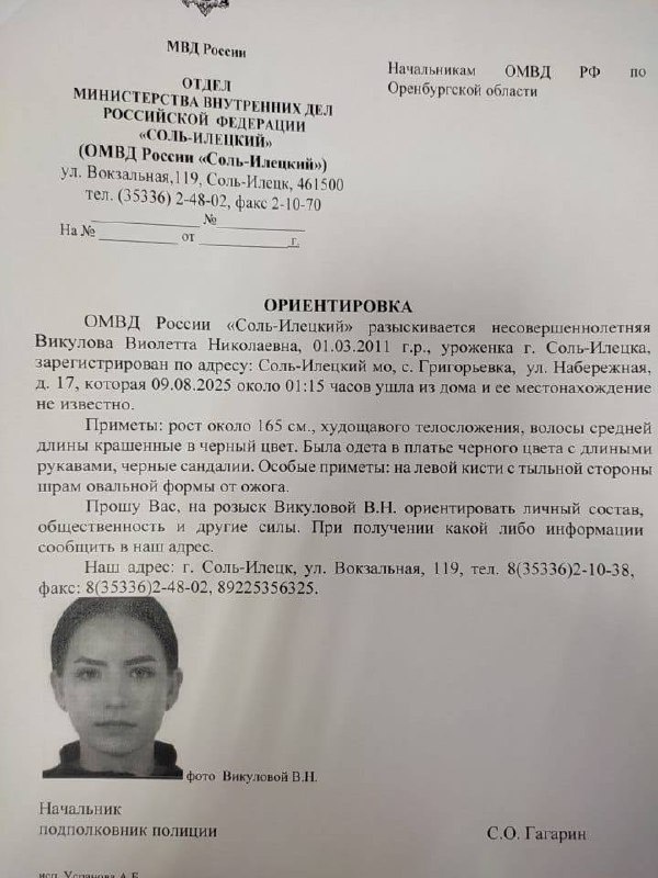 В Оренбургской области г. Соль-Илецк пропала несовершеннолетняя девушка 2011 года рождения Викулова Виолетта