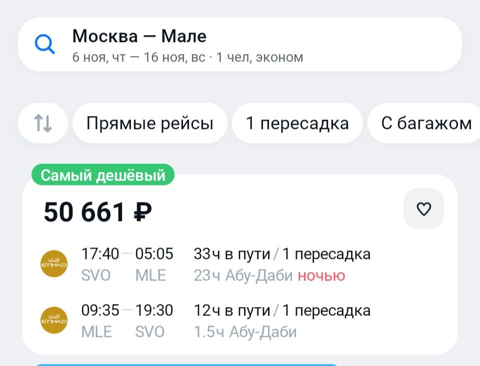 Одна из любимых рубрик админа: #мальдивыдешевлетаиланда 🌴🌴 Весь октябрь-ноябрь со стыковками на Ближнем Востоке можно сгонять на райские острова вот за такой 👆ценник. https://aviasales.tpm.lv/QvGpmwSU Авиакомпанию можно выбрать)) хоть Этихад тебе, хоть Оман Эйр. А прямой? А нацпер выдает за 92к. Без багажа 🙈🙈 бывали на Мальдивах? Дайте 🥰 #MLE @KJA