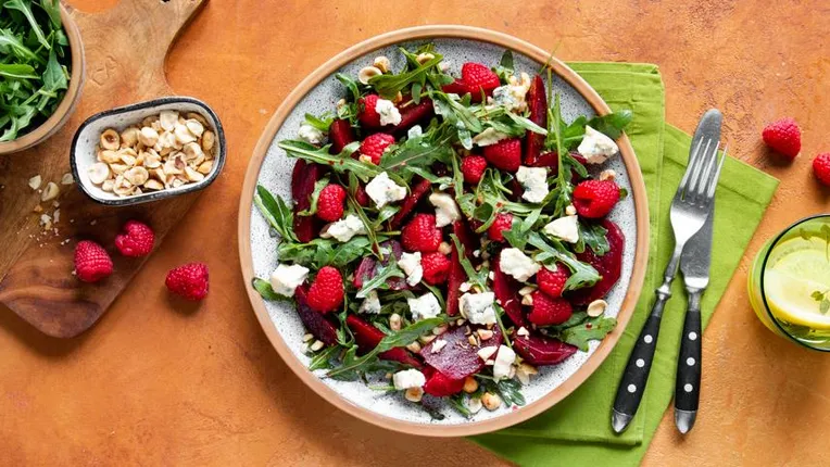 Салат из печёной свёклы с малиной и тминным кремом — это яркое, ароматное и необычное блюдо, которое объединяет сладость запеченной свеклы, свежую кислинку малины и пряные ноты тмина в нежном соусе. Такой салат станет отличным вариантом для легкого обеда, изысканной закуски на праздничный стол или просто для тех, кто любит открывать новые вкусы. Готовится несложно, а результат радует и глаз, и желудок. Сложность: просто