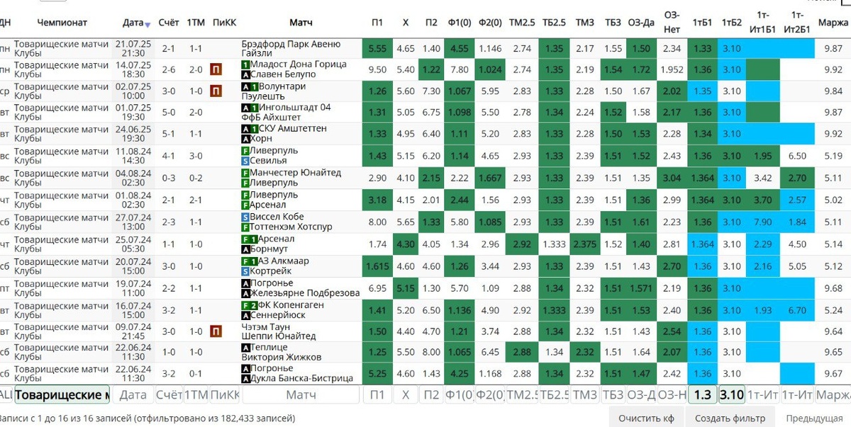 По следам РЕВЕРС-АНАЛИЗА Бет-База 3.0 🔥 Телеграм-канал (уклон на ТОТАЛ в 1-ом тайме!) Бывает даже коэффициент 1.3+ – почти 100% ? Товарищеские матчи. Клубы. При условии, что на тотал в 1-ом тайме больше 1 дают 1.3, а на тотал больше 2 в первом тайме дают 3.10 – то минимум 1 гола забивается всегда! Дистанция ГОД! И таких вариантом можно куча найти в любой Бет-Базе (COM, PRO, 3.0) – просто научитесь делать реверс-анализ! Телеграм-канал