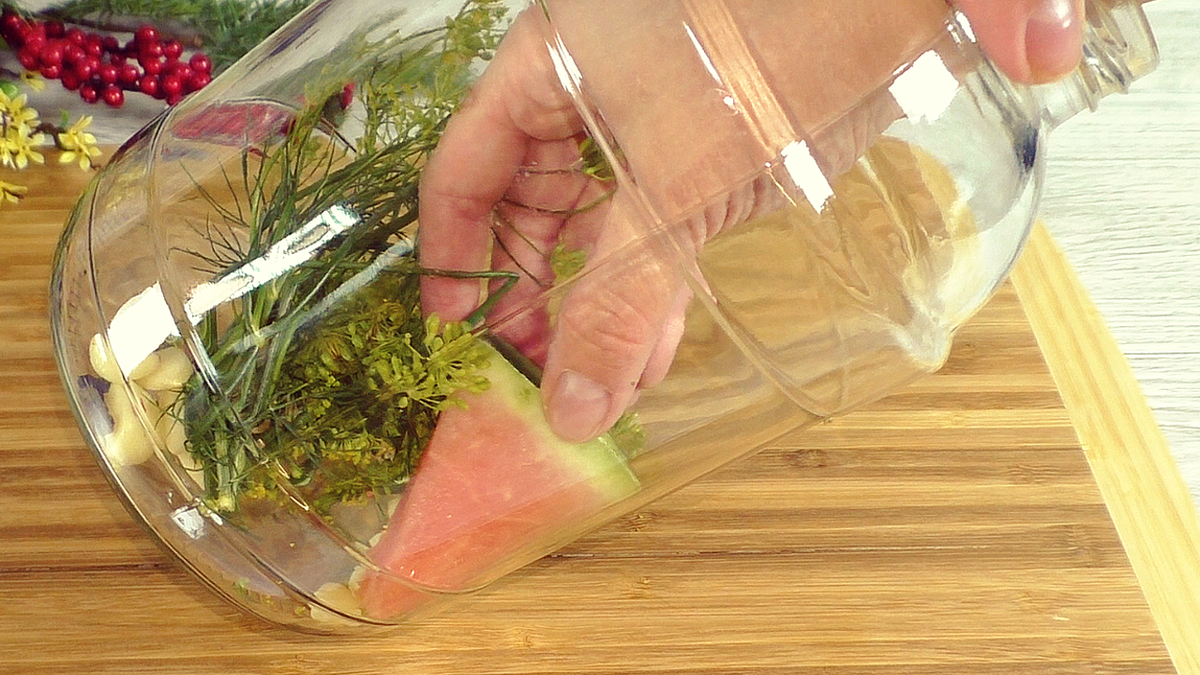 Я готовлю в 3-литровых банках. Нарезаю арбуз на кусочки, которые легко "войдут" в банку.