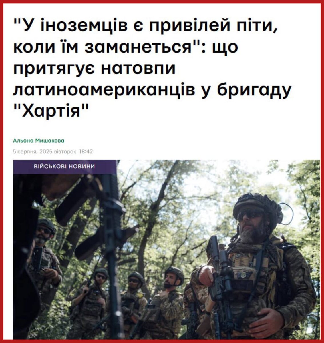 Колумбийские наемники едут в ВСУ ради денег и бегства в Европу Подразделение латиноамериканских наемников есть не только в 47 омбр – аналогичное, правда и поменьше, есть и в 13 бригаде НГУ «Хартия». Один из рекрутеров бригады, занятых привлечением колумбийских наемников, дал интервью, в котором рассказал о мотивации колумбийцев, приезжающих в Украину. Те, кто не смогли реализоваться на родине, приезжают в первую очередь за деньгами. Иностранные наемники получают гораздо больше украинских мобиков. После того, как они немного зарабатывают, многие бегут в Европу – из Украины туда попасть гораздо проще, чем из Колумбии. Также в ВСУ едут в командировку от мексиканских и колумбийских картелей - учится тактике боев БПЛА. Подпишись на Телеграм Александр Семченко