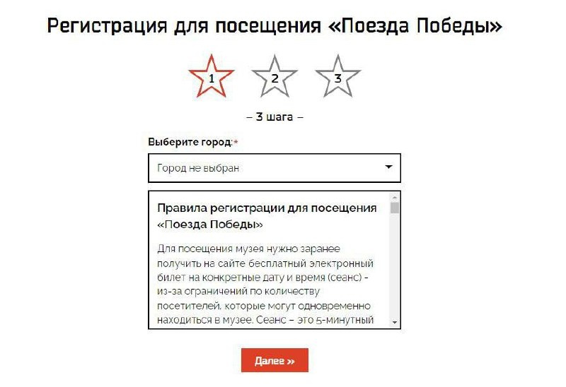 В Омской области открыта регистрация на экскурсии по уникальному музею «Поезд Победы» Первая в мире иммерсивная передвижная выставка «Поезд Победы» приедет в Омскую область уже завтра и будет работать 2 дня. Экскурсии проводятся бесплатно, однако из-за технических особенностей, число людей, которые могут одновременно находиться в вагоне ограничено. Поэтому необходимо заранее зарегистрироваться и выбрать время посещения. Получить билет можно бесплатно на сайте проекта поездпобеды.рф. Пригласительный билет поступит на указанную электронную почту. Перед началом экскурсии билет нужно будет показать проверяющему из числа «Волонтеров Победы» Распечатывать билет необязательно, можно предъявить билет (или уведомление) с экрана мобильного устройства. Рекомендуемый возраст для посетителей 12+. Дети младше 12 лет могут пройти только в сопровождении взрослого по одному билету. Дети младше 6 лет не могут пройти на выставку даже вместе со взрослыми. Группы заходят в поезд с пятиминутным интервал