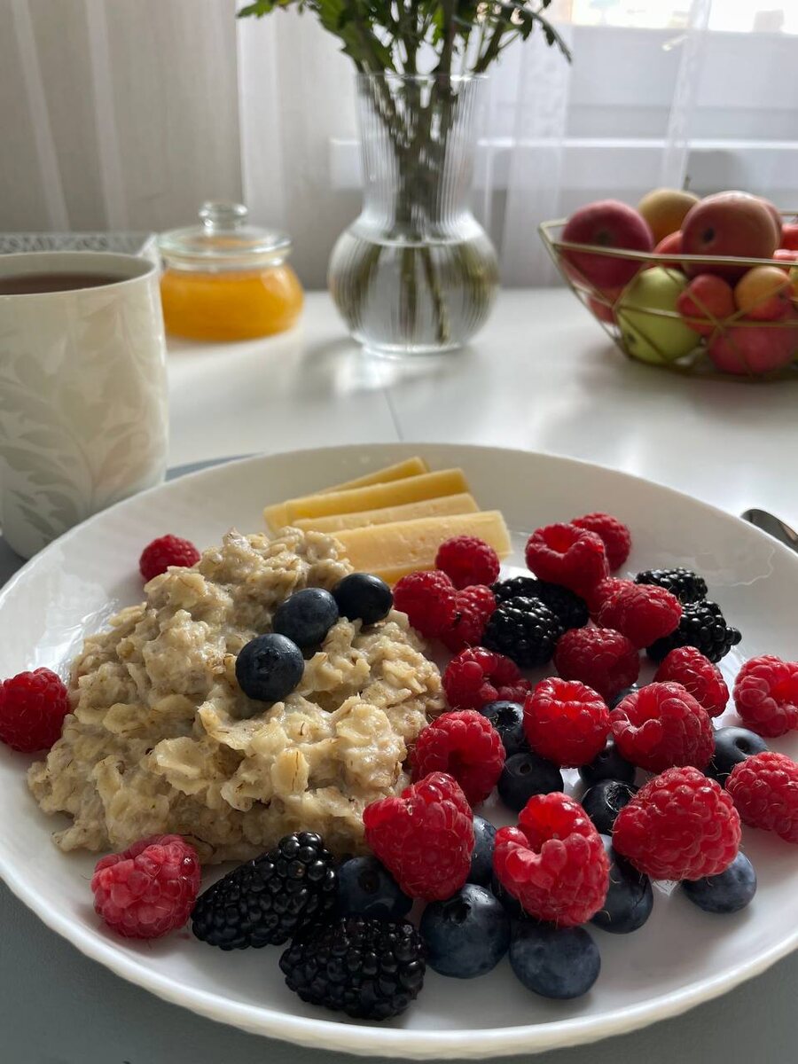 Вчера: на завтрак овсянка с сыром и ягодами; на обед гречка с говяжьим фаршем в томатном соусе с оливками от бариллы с овощами и арбуз, на