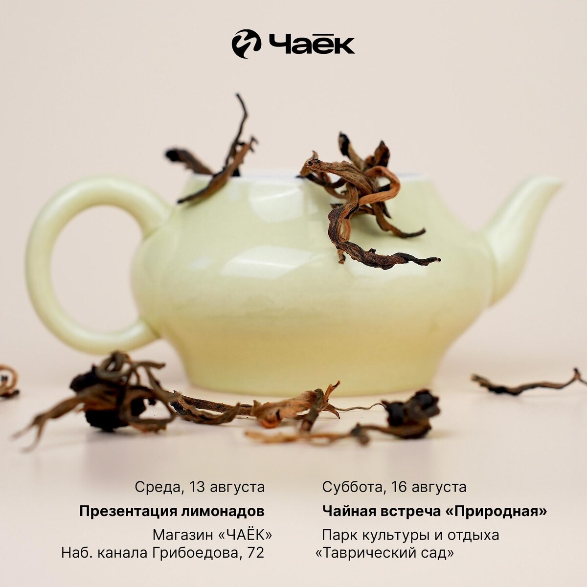 🍵 Презентация и чайная встреча 13 и 16 августа 1. Презентация лимонадов Приглашаем на релиз нашего нового продукта — чайного лимонада! Вас ждут дегустация, угощения и рассказ о создании продукта. Важно: мы не планируем продавать лимонады в магазине, они будут представлены исключительно на маркетплейсах. Также мы торжественно вручим призы победителям третьего промежуточного розыгрыша «ЛЯМ ЗА ЧАЙ». 📅 Среда, 13 августа, 13:00–22:00 💵 Бесплатно 2. Чайная встреча «Природная» Устраиваем в Таврическом саду чаепитие с дегустацией различных сортов чая. Синоптики обещают замечательную погоду! Расположимся на полянке в тени деревьев. Захватите с собой плед/стул, пиалу и хорошее настроение. Встречаемся в 15:00. Участие бесплатное, но чтобы присоединиться, оставьте «+» в комментариях (там же мы оставим геолокацию в день встречи). 📅 Суббота, 16 августа, 15:00 💵 Бесплатно 3. «Тет-а-тет» Вы можете записаться на индивидуальную чайную встречу, выбрав удобное для себя время, количество гостей и с