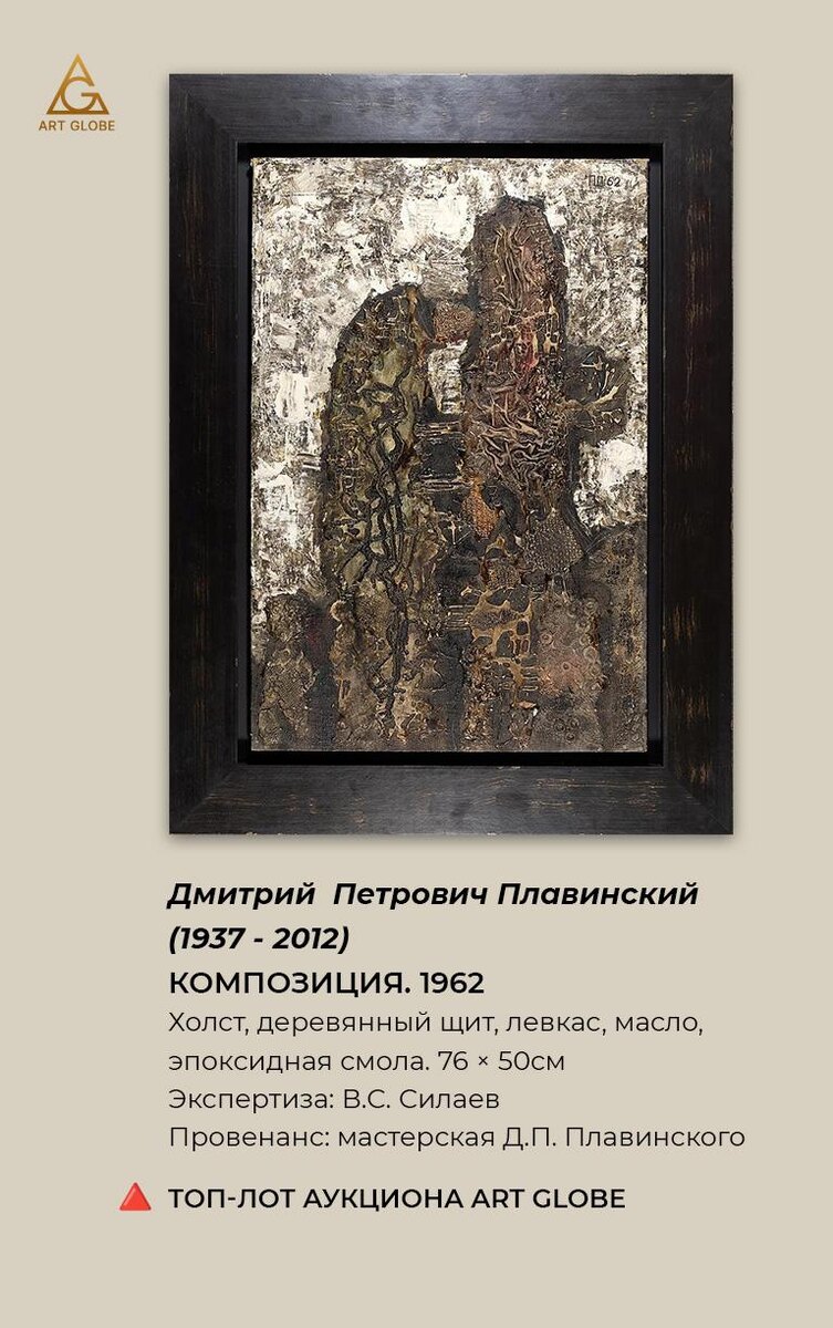 📌 Топ-лот аукциона Art Globe Дмитрий Плавинский Композиция. 1962 Холст, деревянный щит, левкас, масло, эпоксидная смола. 76 × 50см Работа, в которой можно заблудиться, как в древнем городе, раскопанном археологами. В начале 1960-х Плавинский много жил и работал в Средней Азии. Там он собирал «археологический словарь» — фрагменты культур, символов, фактур, из которых строил свои картины. В Композиции линии и рельефы сплетаются в единый «хиромантический отпечаток времени» — где судьбы разных эпох и цивилизаций встречаются в одном пространстве. Плавинский не просто фиксировал увиденное — он буквально вживлял в холст материю культур, выстраивая мост между древностью и настоящим. Это искусство, которое можно рассматривать часами, находя всё новые и новые «отпечатки». Художник — один из ярких представителей нонконформистов-шестидесятников, создатель направления структурный символизм, человек, для которого живопись была исследованием мира. 🎯 Экспертиза: В. С. Силаев 📜 Провенанс: Мастер