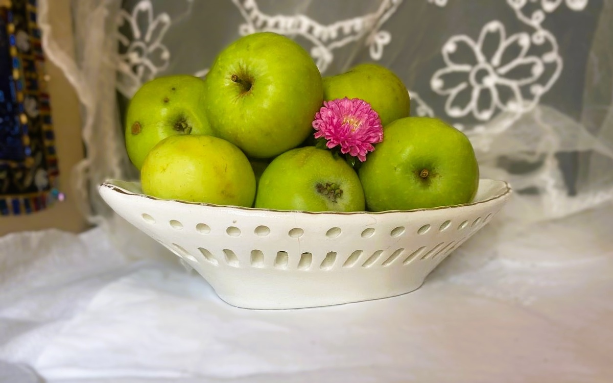 И вот на импровизированном прилавке на земле я увидела две чашки, покорившие меня тем, что на дне у них рисунок клубнички. Чашки оказались целые, по 100 рублей за штуку. У этого же продавца я купила ещё три предмета. Покажу их ниже – уже чистыми и блестящими.