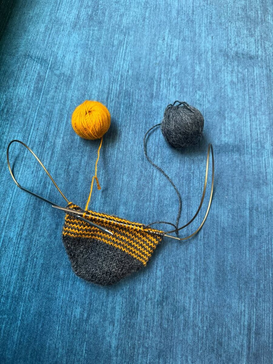 Ну-с, как дела? Что вяжете? Перекличка выходного дня у нас с вами. У меня дорожный проект — один носок) Один, потому что хеликсом я начинаю носки по одному, а после пятки объединяю на одни спицы, чтобы не считать ряды для паголенка. А у вас что в работе?
